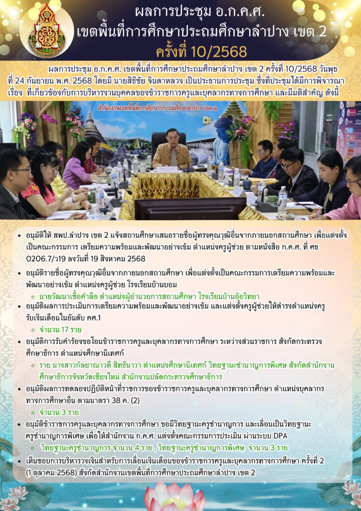 ผลการประชุม อ.ก.ค.ศ.เขตพื้นที่การศึกษาประถมศึกษาลำปาง เขต 2 ครั้งที่ 10/2568 กันยายน 25, 2025 by Poobeth Chaisen