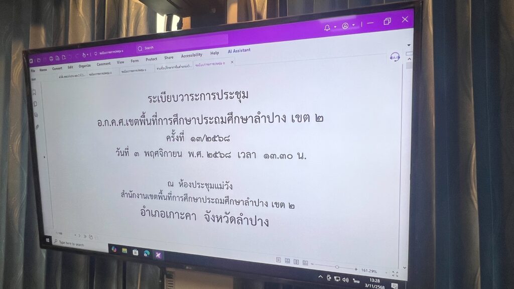 วันที่ 3 พฤศจิกายน 2568 เวลา 13.30 น. นายสิธิชัย จินดาหลวง ประธาน อ.ก.ค.ศ. เป็นประธานการประชุม อ.ก.ค.ศ. เขตพื้นที่การศึกษาประถมศึกษาลำปาง เขต 2 ครั้งที่ 13/2568 เพื่อแจ้งให้ทราบ รับรอง และเสนอ ตามระเบียบวาระการประชุมต่างๆ โดยมี นายสมบัติ สิริวงศ์เครือผอ.สพป.ลำปาง เขต 2 ในฐานะเลขานุการ อ.ก.ค.ศ. เขตพื้นที่การศึกษาประถมศึกษาลำปาง เขต 2 พร้อมด้วยคณะกรรมการฯ และเจ้าหน้าที่กลุ่มบริหารงานบุคคล เข้าร่วมประชุม ณ ห้องประชุมแม่วังสพป.ลำปาง เขต 2