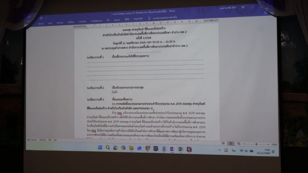 วันที่ 21 พฤศจิกายน 2568 เวลา 09.30 น. นายสมบัติ สิริวงศ์เครือ ผู้อำนวยการสำนักงานเขตพื้นที่การศึกษาประถมศึกษาลำปาง เขต 2 เป็นประธานการประชุมพิจารณาการขอจัดตั้งงบประมาณรายจ่ายประจำปีงบประมาณ พ.ศ. 2570 งบลงทุน ค่าครุภัณฑ์ ที่ดินและสิ่งก่อสร้างสำหรับโรงเรียนในสังกัด ตามที่สำนักงานคณะกรรมการการศึกษาขั้นพื้นฐานได้แจ้งกรอบวงเงินสำหรับการเสนอขอตั้งงบประมาณดังกล่าว เพื่อให้สำนักงานเขตพื้นที่การศึกษาและโรงเรียนในสังกัดดำเนินการเสนอขอจัดตั้ง งบประมาณดังกล่าวตามความขาดแคลนจำเป็นด้านครุภัณฑ์และด้านอาคารสิ่งก่อสร้าง โดยมีนโยบายมุ่งเน้นการสร้างโอกาสให้นักเรียนเข้าถึงการศึกษาที่มีคุณภาพการพัฒนาผู้บริหาร ครู และบุคลากรทางการศึกษาให้มีความพร้อมทั้งสมรรถนะและศักยภาพการพัฒนาโรงเรียนให้มีความเข้มแข็งทางวิชาการ สามารถให้บริการการศึกษาแก่นักเรียนและชุมชน พร้อมส่งเสริมการมีส่วนร่วมของเอกชน บ้าน วัด / ศาสนสถานอื่น ๆ ของรัฐ และโรงเรียนให้มีคุณภาพ รวมทั้งนโยบายส่งเสริมความปลอดภัย ตามนโยบายการลดภาระครูและบุคลากรทางการศึกษา และนโยบายลดภาระนักเรียนและผู้ปกครอง โดยแบ่งการเสนอจัดตั้งงบประมาณในส่วนของโรงเรียนออกเป็น 2 รายการ โรงเรียนคุณภาพตามนโยบาย 1 อำเภอ 1 โรงเรียนคุณภาพ และสิ่งก่อสร้าง/ปรับปรุงซ่อมแซม โดยมี นายประชา ไชยศรี รองผู้อำนวยการสำนักงานเขตพื้นที่การศึกษาประถมศึกษาลำปาง เขต 2คณะกรรมการผู้เกี่ยวข้องเข้าร่วมประชุม ณ หอประชุมลำปางหลวง สำนักงานเขตพื้นที่การศึกษาประถมศึกษาลำปาง เขต 2