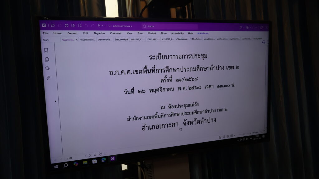 วันที่ 26 พฤศจิกายน 2568 เวลา 13.30 น. นายสิธิชัย จินดาหลวง ประธาน อ.ก.ค.ศ. เป็นประธานการประชุม อ.ก.ค.ศ. เขตพื้นที่การศึกษาประถมศึกษาลำปาง เขต 2 ครั้งที่ 14 / 2568 เพื่อแจ้งให้ทราบ รับรอง และเสนอ ตามระเบียบวาระ การประชุมต่างๆ โดยมี นายสมบัติ สิริวงศ์เครือ ผอ.สพป.ลำปาง เขต 2 ในฐานะเลขานุการ อ.ก.ค.ศ. เขตพื้นที่การศึกษาประถมศึกษาลำปาง เขต 2 พร้อมด้วยคณะกรรมการฯ และเจ้าหน้าที่กลุ่มบริหารงานบุคคล เข้าร่วมประชุม ณ ห้องประชุม แม่วัง สพป.ลำปาง เขต 2