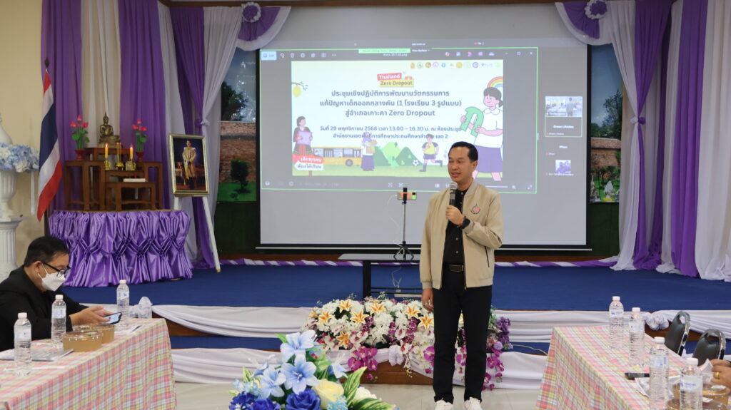 วันที่ 29 พฤศจิกายน 2568 เวลา 13.30 น. นายสมบัติ สิริวงศ์เครือ ผู้อำนวยการสำนักงานเขตพื้นที่การศึกษาประถมศึกษาลำปาง เขต 2 มอบหมายให้ นายชยพล ศรีประดิษฐ์ รองผู้อำนวยการสำนักงานเขตพื้นที่การศึกษาประถมศึกษาลำปาง เขต 2 พร้อมด้วย นางโสภา สุภาสอน ผู้อำนวยการกลุ่มส่งเสริมการจัดการศึกษา นายชาญวิทย์ ตันกอง นักวิชาการศึกษาชำนาญการ และนางสาวชนันยา วงศ์สมศักดิ์ นักจิตวิทยาโรงเรียนประจำเขตพื้นที่การศึกษา เข้าร่วมการประชุมพัฒนานวัตกรรมการแก้ปัญหา เด็กออกสู่กลางคันสู่ “อำเภอเกาะคา Zero dropout จังหวัดลำปาง” โดยความร่วมมือระหว่าง สำนักงานคณะกรรมการการศึกษา ขั้นพื้นฐานกับกองทุนเพื่อความเสมอภาคทางการศึกษา (กสศ.) ณ หอประชุมลำปางหลวง สำนักงานเขตพื้นที่การศึกษาประถมศึกษาลำปาง เขต 2