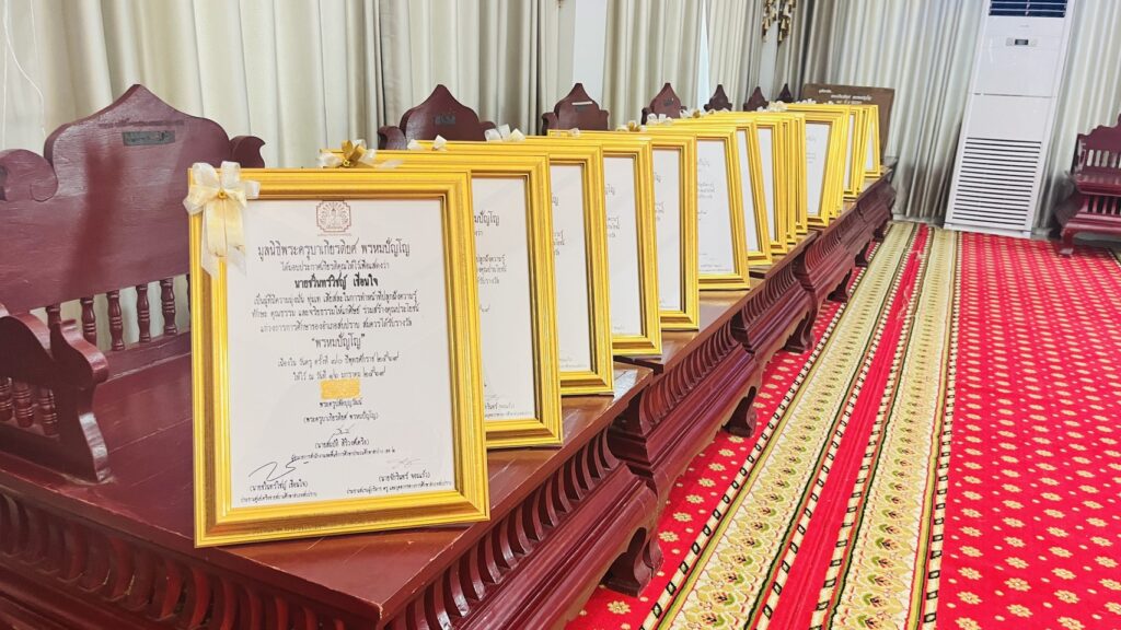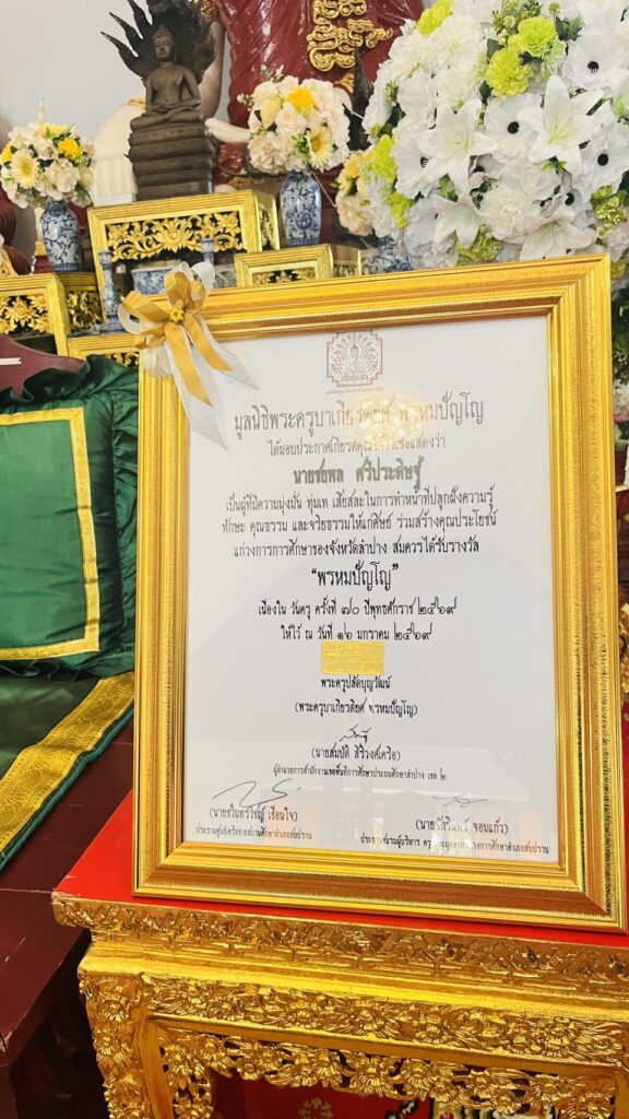 วันที่ 24 มกราคม 2569 นายชยพล ศรีประดิษฐ์ รองผู้อำนวยการสำนักงานเขตพื้นที่การศึกษาประถมศึกษาลำปาง เขต 2 เข้ารับรางวัลประกาศเกียรติคุณ รางวัล “พรหมปัญโญ” ลายเซ็นแผ่นทองคำ พร้อมด้วย นางสาวพิลาวรรณ หอระดี ศึกษานิเทศก์ เข้ารับรางวัลประกาศเกียรติคุณ รางวัล “พรหมปัญโญ” จากมูลนิธิพระครูบาเกียรติยศ พรหมปัญโญ โดยได้รับเมตตามอบรางวัลจาก พระครูปลัดบุญวัฒน์ (พระครูบาเกียรติยศ พรหมปัญโญ) ณ วัดบ้านแก่น อ.สบปราบ จ.ลำปาง